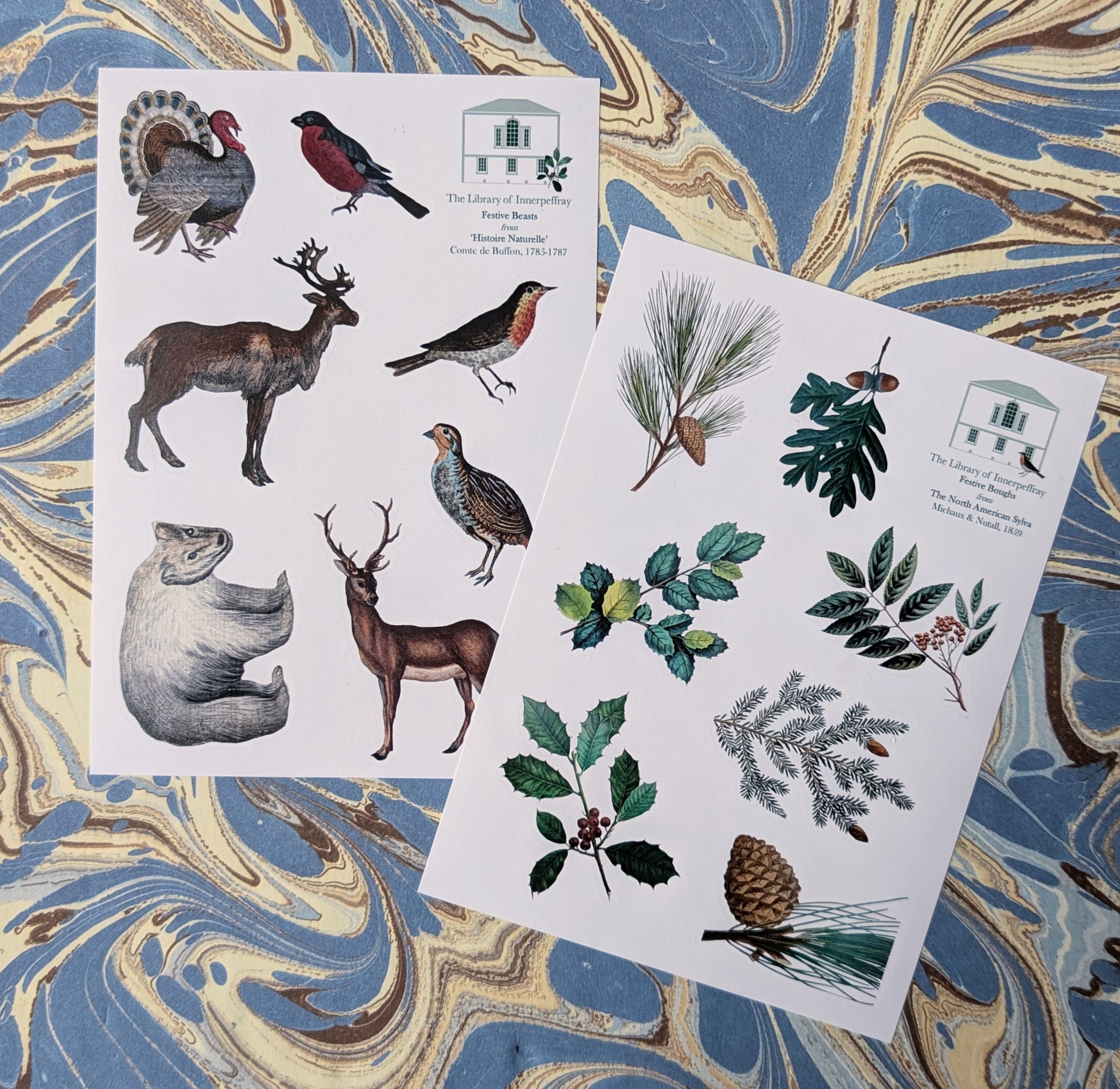 An A6 sheet of festive stickers – beautiful beasts from Buffon’s ‘Histoire Naturelle’ (1785-1787) or green boughs from the North American Sylva (Michaux & Nutall, 1859). Why not buy both, and spruce up your gift labels and Christmas cards?
